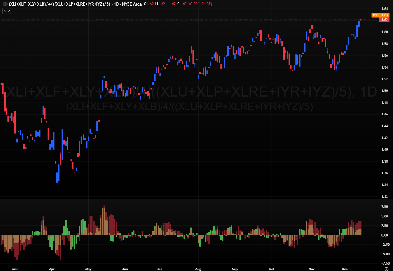 ((XLI+XLF+XLY+XLB)/4) / ((XLU+XLP+XLRE+IYR+IYZ)/5)
