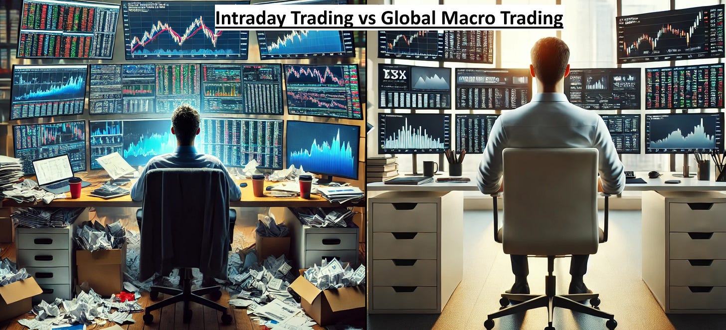 Intraday trading subjects you to a multitude of opaque and noisy elements, where distinguishing valuable signals can be challenging. In contrast, global macro trading provides more "room to breathe" by focusing on shifts in observable and testable economic indicators, allowing for strategic, data-driven decisions rather than reaction to fleeting market fluctuations.